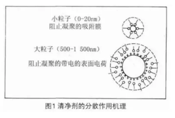 分散作用又可稱為懸浮或膠溶,即清凈劑能將已經形成的漆膜、膠質和積炭等固體小顆粒加以吸附,在其表面形成一層覆蓋膜而分散在油中,阻止這些非油溶性顆粒聚集成較大的顆粒沉積或黏附于氣缸上。清凈劑的分散作用機理見圖1。