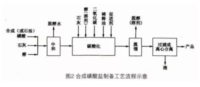 按合成途徑分,以潤滑油餾分作為原料生產的磺酸鹽為石油磺酸鹽;而以各種合成烷基苯為原料生產的磺酸鹽為合成磺酸鹽。石油磺酸鹽是以相對分子質量為380的潤滑油餾分為原料。合成磺酸鹽的制備(以鈣鹽為例)是以生產12-烷基苯的副產物重烷基苯或烯經與苯烷基化制得的合成烷基苯為原料,然后用發(fā)煙硫酸或So3進行磺化,得到石油磺酸或合成磺酸;再用石灰與磺酸反應(金屬化)生成中性磺酸鈣鹽;最后碳酸化,在醇類促進劑存在條件下,加入石灰并通入二氧化碳,得到中堿值或高堿值磺酸鈣鹽。合成磺酸鹽的制備工藝流程見圖2。