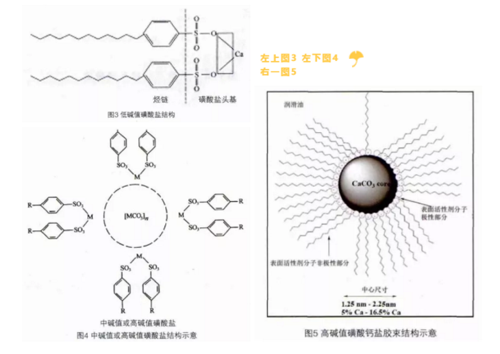 低堿值磺酸鹽結構見圖3,中堿值或高堿值磺酸鹽結構見圖4,高堿值磺酸鈣鹽的膠束結構見圖5。